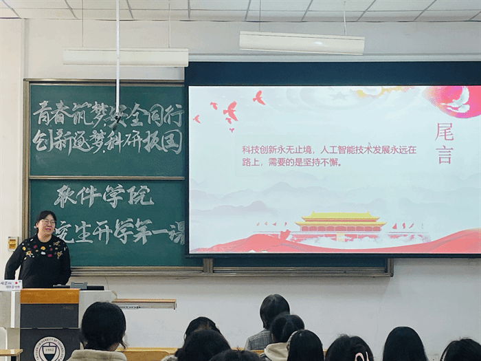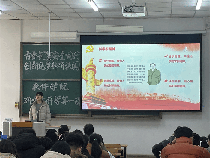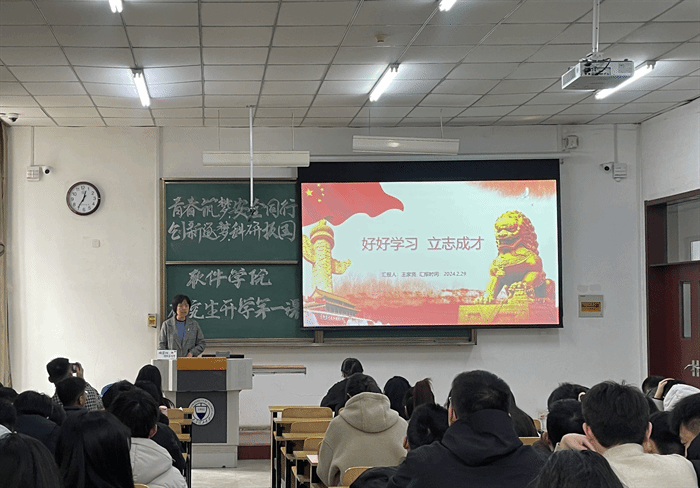 2月29日,软件学院党委副书记郭飞、副院长冯秀芳面向全院研究生开讲“开学第一课”。郭飞通过热点话题“命运的齿轮开始转动”,从国家、社会、个人等层面出发,引导同学们在新的学期不负自己,不负人民,不辱使命!冯秀芳以自己多年教育经验为切入点,用亲切和睿智的语言教育同学们脚踏实地、勇于创新,将技术应用到实际的软件开发和系统设计中,积极投身国家科技创新发展中去。现场还围绕“青春筑梦 安全同行 创新逐梦 科研报国”的主题进行了交流分享。研究生党员王家贤生动的介绍了科学家吴文俊的故事,他说“我们要用科学理论武装自己,主动担责,积极参与到国家建设当中,让青春在全面建设社会主义现代化国家的火热实践中绽放绚丽之花。”