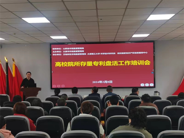 3月8日,在并高校和科研院所存量专利盘点工作培训与研讨会在350vip浦京集团官网迎西校区图书馆隆重举行。本次活动由山西省市场监督管理局(知识产权局)指导,太原市市场监督管理局(知识产权局)主办,万柏林区市场监管局、350vip浦京集团官网科学技术研究院和知识产权信息服务中心承办,旨在深入实施《专利转化运用专项行动方案(2023—2025年)》和《高校和科研机构存量专利盘活工作方案》,加速推动高校和科研院所对现有专利的梳理与激活,促进专利技术向实际生产力的有效转化。