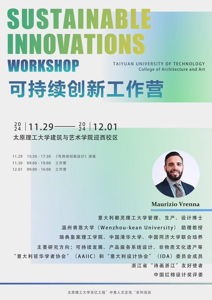 11月29日至12月1日期间,建筑与艺术学院邀请温州肯恩大学助理教授、都灵理工大学产品设计博士Maurizio Vrenna在工业设计系开展“Sustainable Innovations Workshop”(可持续创新工作营),共有32名学生及教师参加。