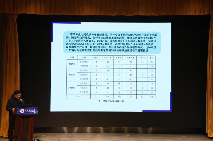 张和平教授介绍体育与健康工程学院2024年度学风建设情况报告,分析体育教育、运动训练专业学生学风现状,他指出体育与健康工程学院始终以立德树人为根本任务,高度重视学风建设,2024年,学院结合学生与专业特点,采取了一系列措施积极营造良好的学习氛围,为同学们的成长成才提供坚实的保障。张体卫宣读《体育与健康工程学院关于表彰2023-2024学年学风建设先进集体以及个人的决定》和表彰名单。