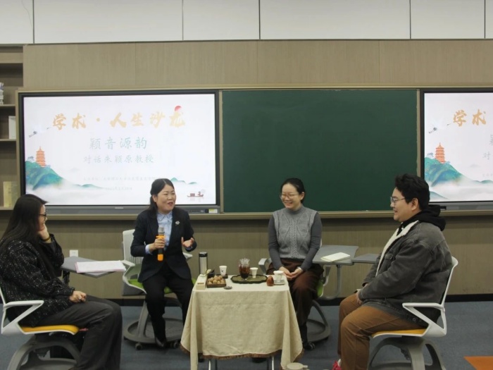此次沙龙以“访谈+互动”形式展开。朱颖原教授结合自身丰富的学术与人生经历,围绕“如何指导学生确定论文选题”“如何在教学中提高课堂吸引力”等议题,深入浅出地分享了自己的见解。她强调,教师应如一条流动的河不断提升自我,方能给予学生新知并为其解惑。同时她提出“内容为王”的教学理念,认为教学中应关注“亮点、热点、疑点”三大方面。