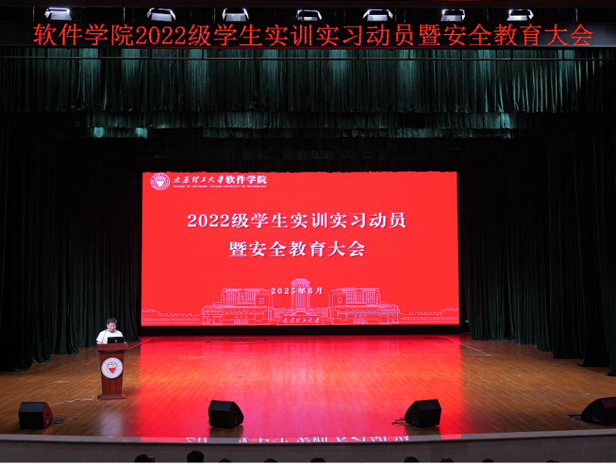 为确保 2022 级学生外出实训实习工作有序开展,6月13日下午,软件学院在明向会堂隆重召开 2022 级外出实训实习工作安排暨安全教育大会,学院党委书记张文基、院长赵涓涓、副书记郭飞、副院长刘松华、软件工程系副主任边婧出席,全体 2022 级辅导员和本科生参加。