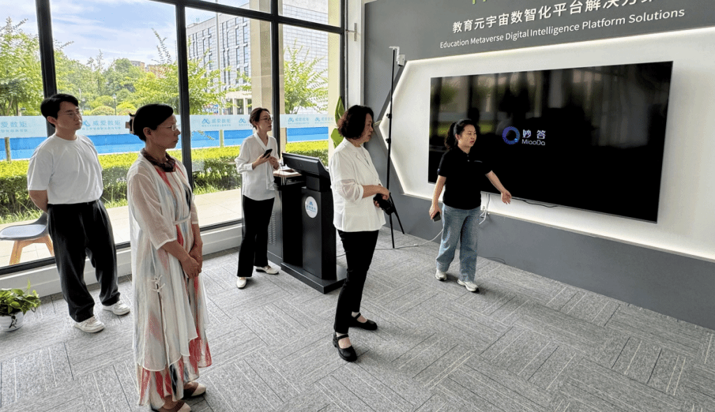 学院代表团首先到访成都威爱数矩(威爱科技数智化教育事业部)办事处。营销经理吴敏详细介绍公司发展概况、元宇宙及VR/MR业务布局,以及AI-LBE(Location Based Education)驱动下的“AI大模型元宇宙沉浸式交互技术联合研发中心”的建设与荣誉。