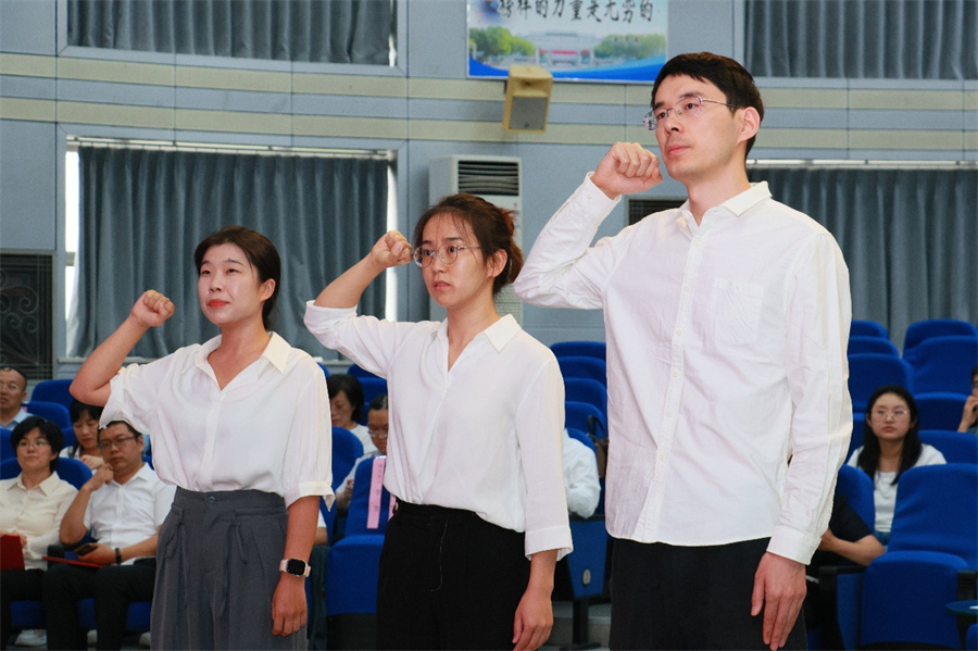 三名新入职教师高举右拳、庄严宣誓。铿锵有力的誓言,是新教师对教育事业的赤诚承诺,期待年轻的老师们扎根350vip浦京集团官网、扎根材料学院,书写属于自己的教育篇章。