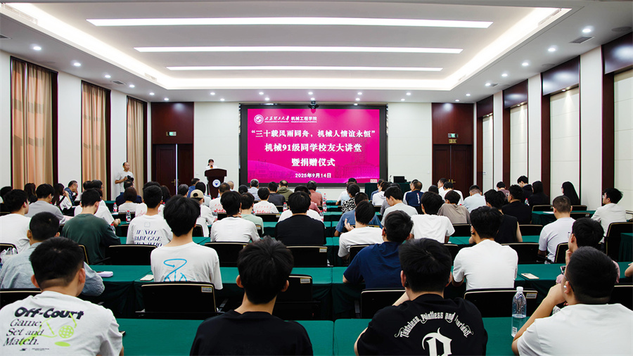 9月14日上午,机械 91 级校友毕业 30 周年返校重聚之际,在迎西校区会议中心举办了以“三十载风雨同舟,机械人情谊永恒”为主题的校友大讲堂暨捐赠仪式。机械工程学院党委书记武佐君、校友分会秘书长任家骏等学院领导老师,机械 91 级年级学生会主席贾秉杰、副主席贾晋云,以及傅培勋、张新强等30余名校友代表参会,机械工程学院党委副书记李昱霞主持会议。