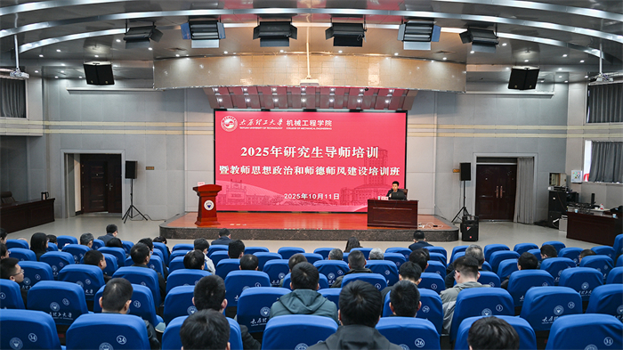 为全面提升教师思想政治素质和道德素养,着力打造师德高尚、业务精湛的高素质专业化教师队伍,为加快学院高质量发展提供坚强支撑。10月11日,机械工程学院在思贤楼三层报告厅举办2025年研究生导师培训暨教师思想政治和师德师风建设培训班。学院党委书记武佐君、院长王涛、副书记李昱霞、副院长丁华,研究生院综合运行办公室主任贾占林、全体研究生导师、班主任和相关管理人员参会。会议由副院长赵敬伟主持。