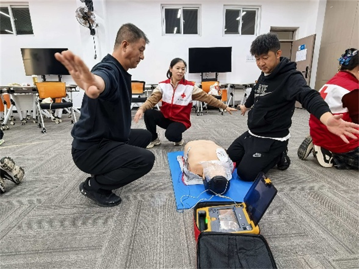 本次培训内容详实,结构紧凑,严格遵循红十字救护员培训大纲。上午为理论知识学习与考核阶段。山西省红十字会的专业讲师系统讲授了红十字运动的基本知识、现场救护的通用原则与标准程序,并重点深入讲解了现场心肺复苏(CPR)的全流程操作技术,包括意识判断、呼救求援、胸外按压、人工呼吸等关键环节,特别涵盖了自动体外除颤器(AED)的使用方法以及针对不同人群气道异物梗阻的急救手法(如海姆立克急救法)。此外,课程还涉及创伤救护的基本技能(止血、包扎、固定、搬运),以及常见急症(如休克、晕厥、心脏病发作)和意外伤害(中暑、烧烫伤等)的现场应对措施。理论学习结束后,全体参训教师通过线上答题方式完成了理论知识考核,巩固了所学内容。