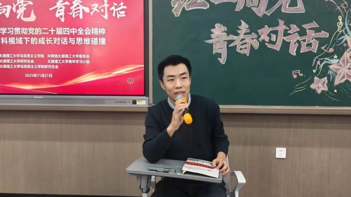 活动中,马克思主义学院青年教师高大为围绕国家发展战略、跨学科素养提升及个人成长路径等主题展开讲解。他结合中国近现代史研究及中央团校培训经历,从历史维度解读了当代中国崛起与党的二十届四中全会战略部署,帮助同学们厘清个人理想与国家发展的内在关联;并结合自身从求学到任教的经历,分享了学术规划技巧、跨学科研究方法及挫折应对经验,强调了马克思主义唯物辩证法在学习工作、科研创新中的指导意义和实践价值,为同学们提供了具有启发性的研究思路。